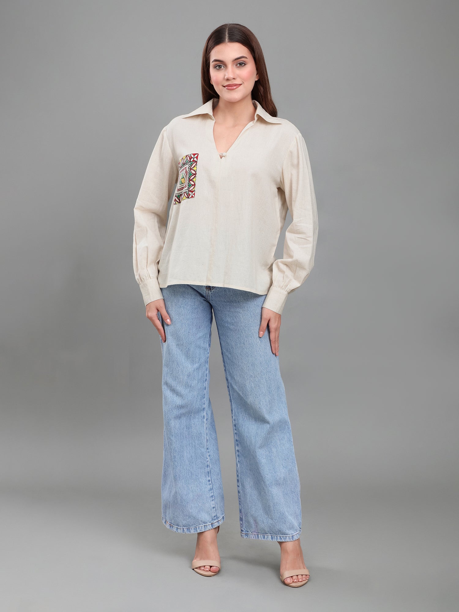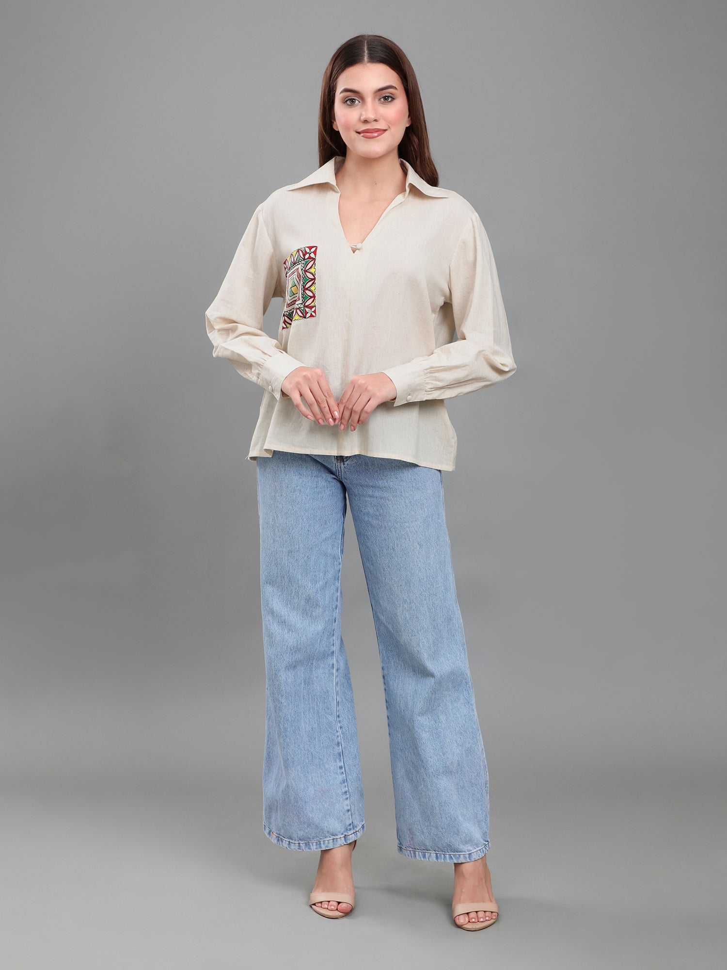 By placing this traditional artwork on a modern office shirt, we connect heritage with everyday wear. It’s not just a design; it’s a symbol of how women bring art, culture, and empowerment into their daily life while still choosing freedom and comfort.