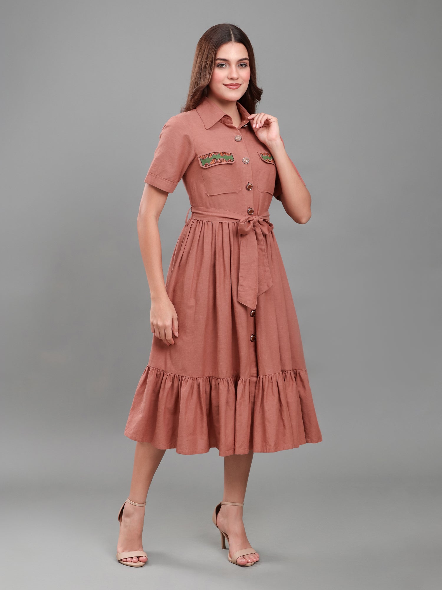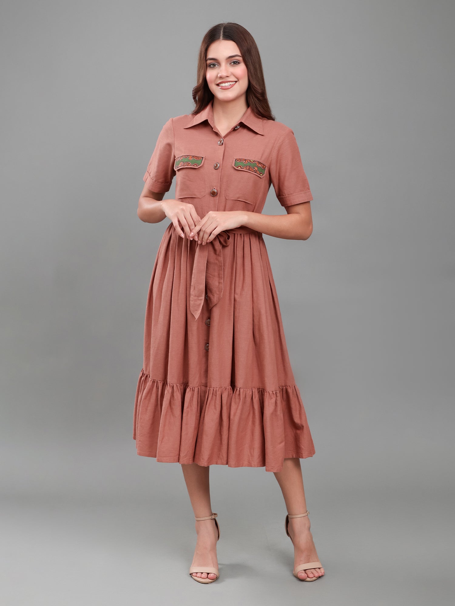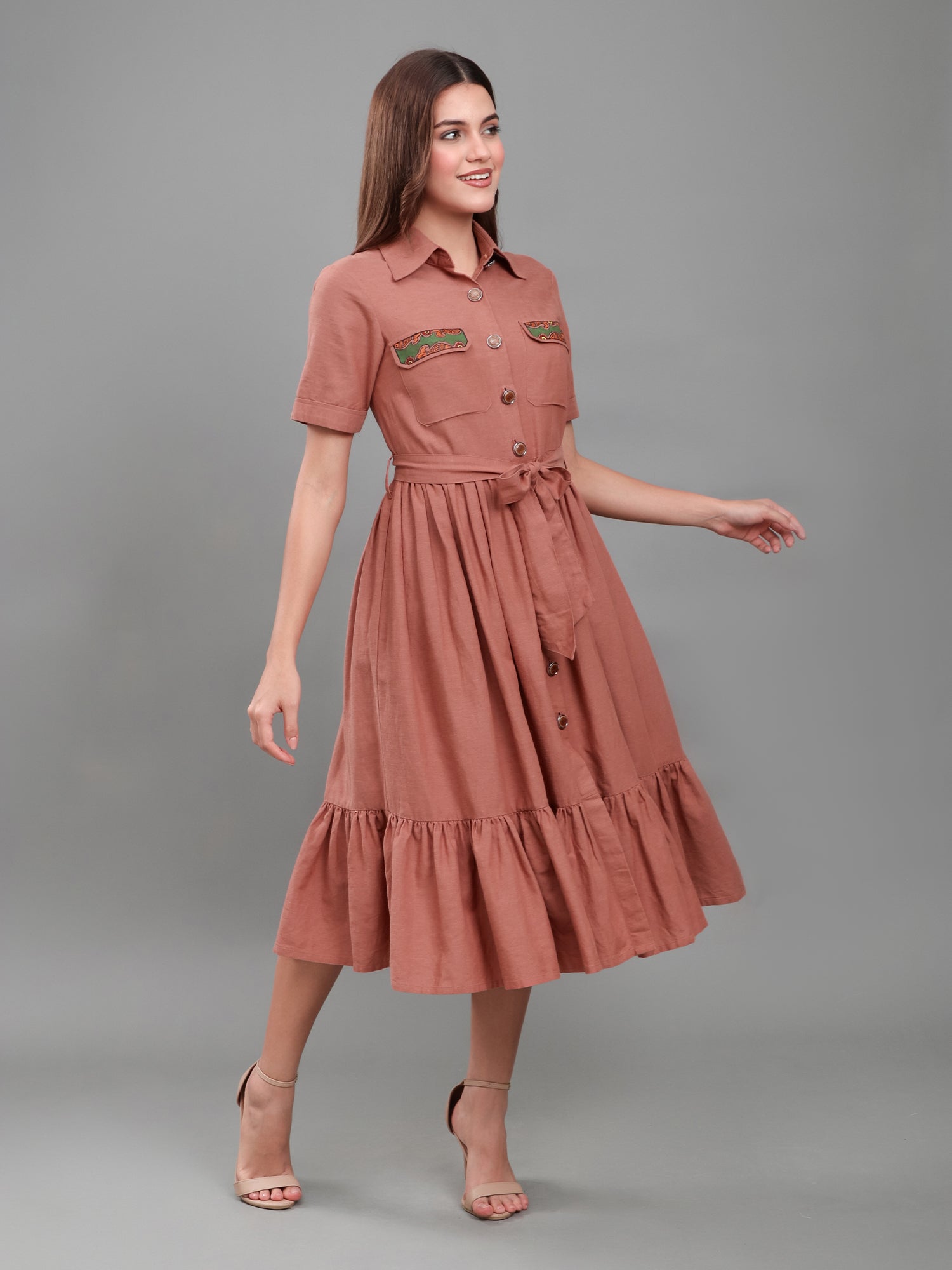 This dress is where modern office wear meets Indian tradition. The front pockets are decorated with Madhubani-inspired fish motifs. In Madhubani art, the fish is a symbol of prosperity, fertility, and good luck. It represents movement, freedom, and the flow of life – just like women who balance many roles with grace and strength.