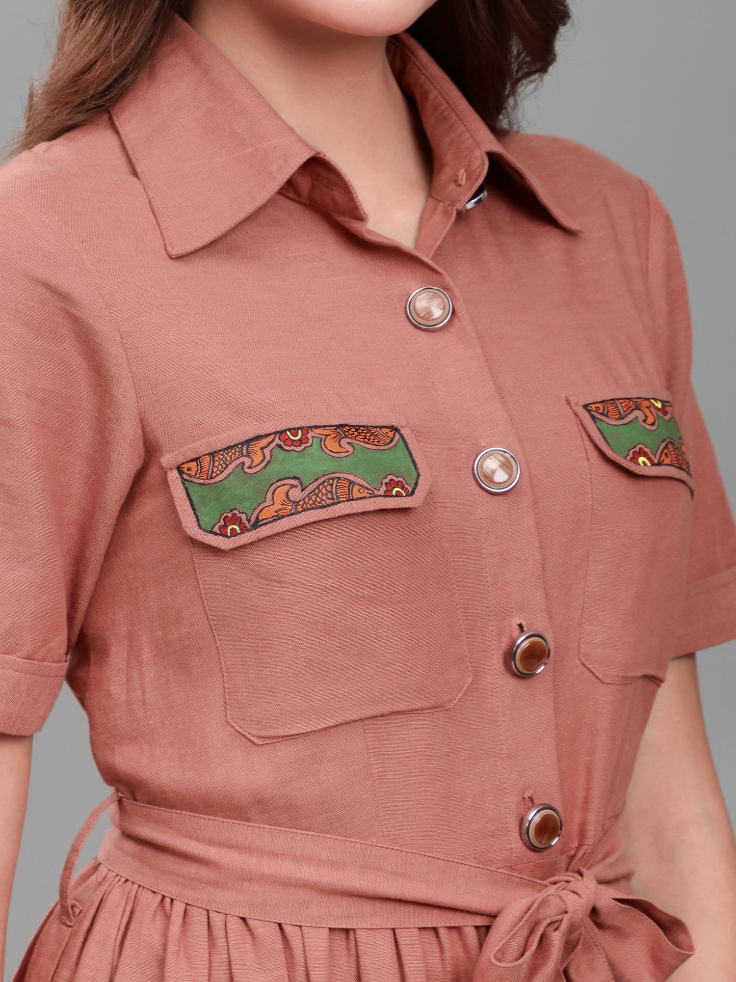 The earthy tones of green, orange, and red make the artwork vibrant yet subtle, blending beautifully with the soft fabric and structured design of the dress. The fish on the pockets are not just decoration – they are a reminder that women carry their power, freedom, and stories with them, even in the smallest details.