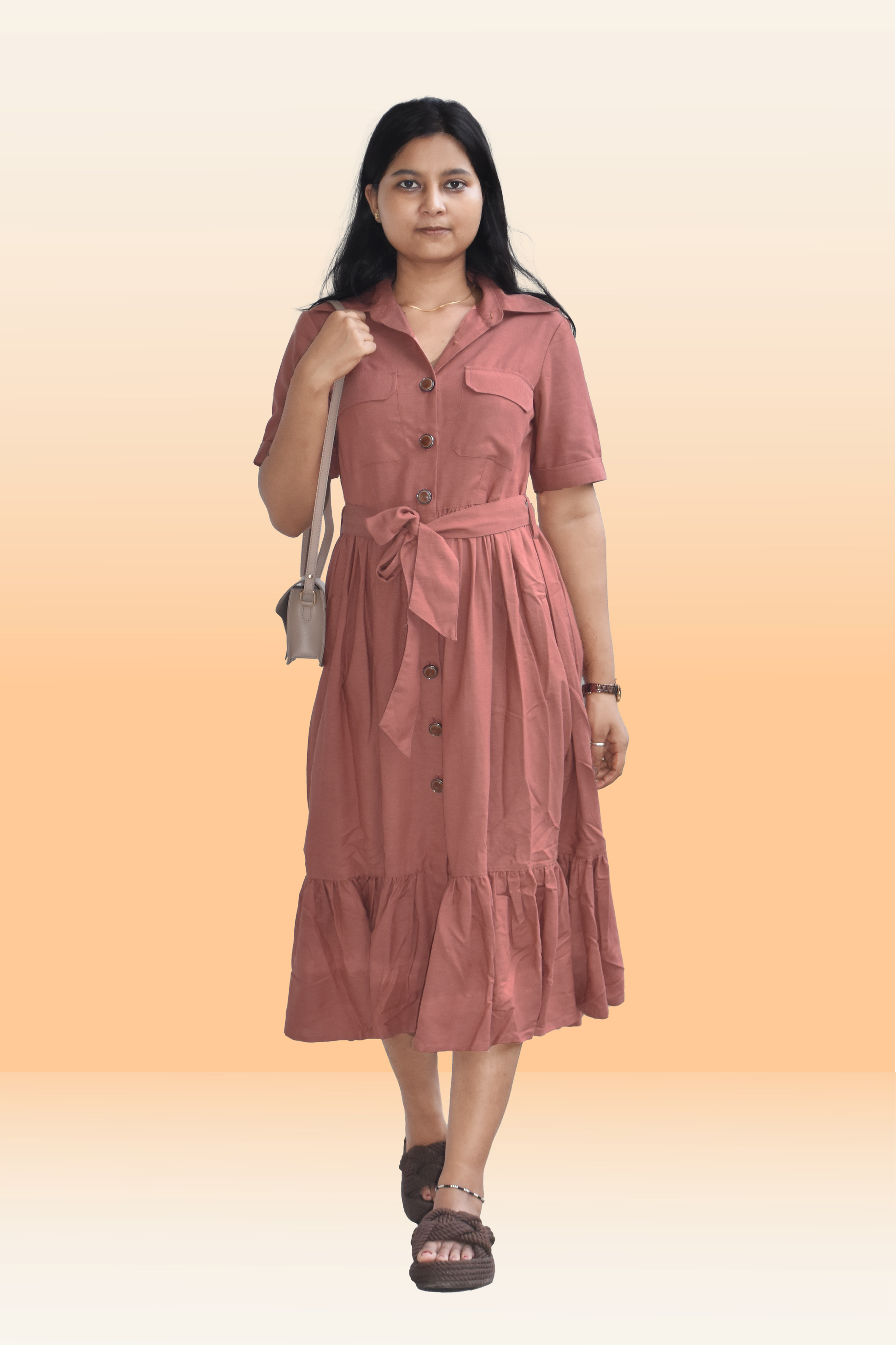 Elevate your everyday look with this effortlessly chic rust brown midi dress. Designed with a flattering fit-and-flare silhouette, it features a smart shirt collar, button-down front, and an adjustable waist tie that enhances your shape. The tiered hemline adds a touch of playfulness, making it perfect for both casual outings and semi-formal gatherings. Pair it with sandals for a relaxed day look or style it with heels for an elegant evening vibe.